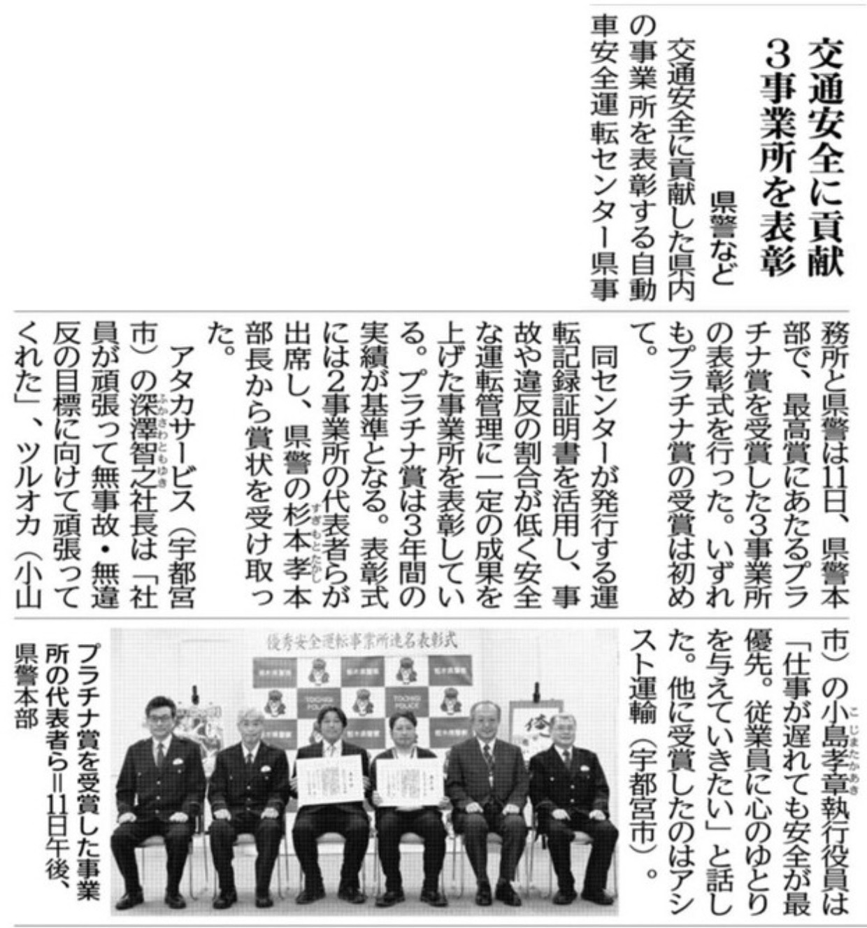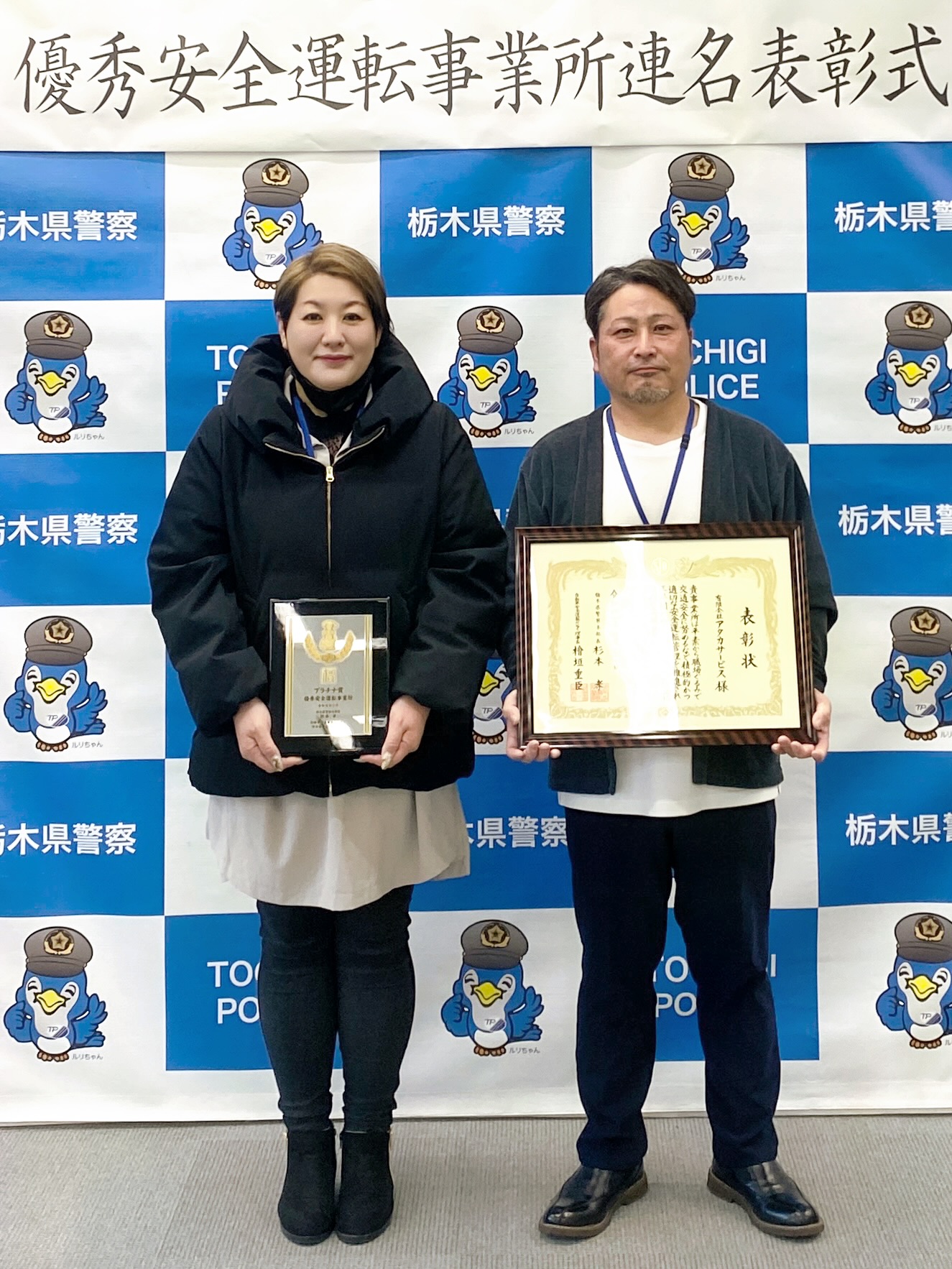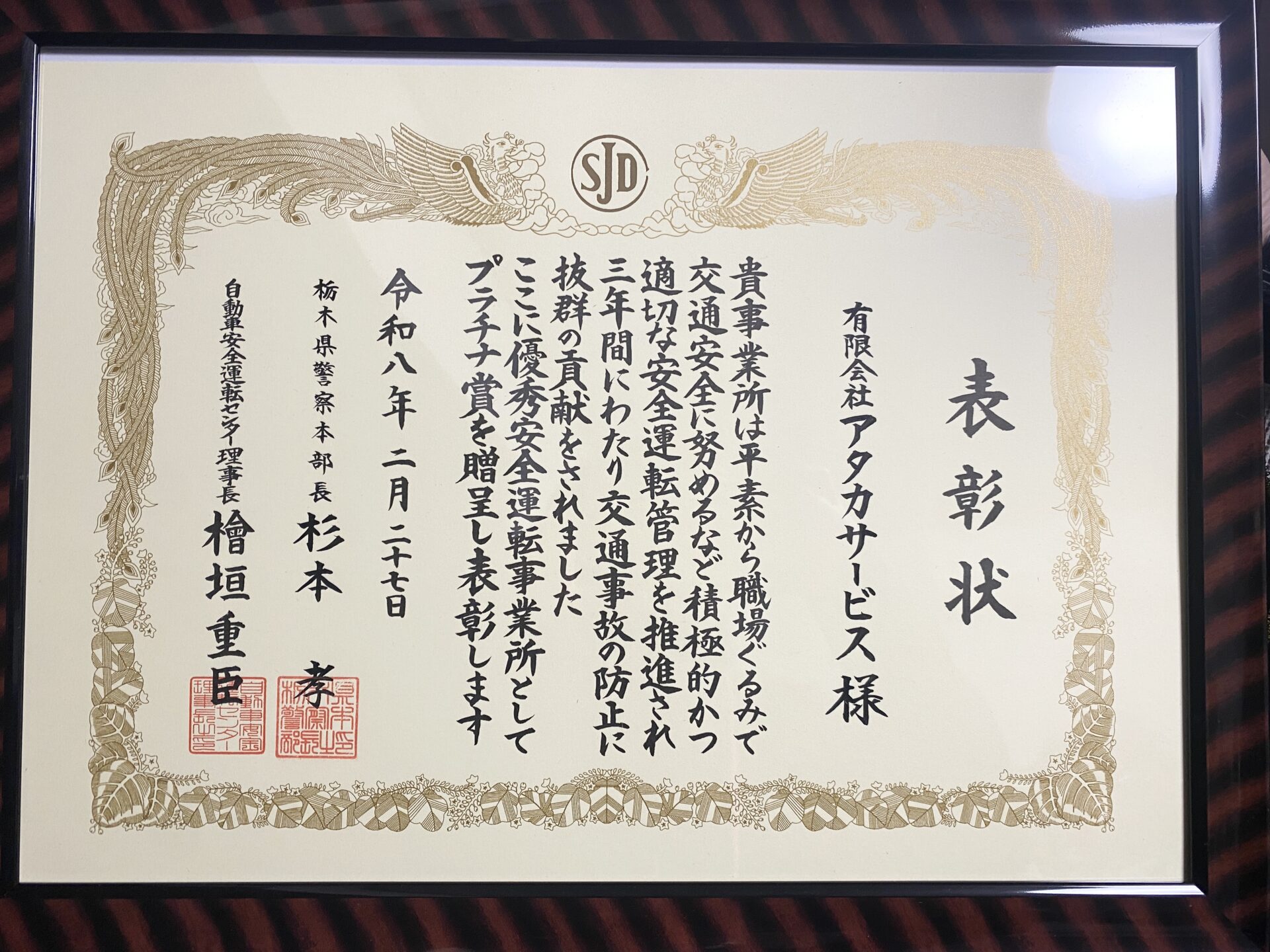 優秀安全運転事業所として金賞を2年連続受賞した事業所、尚且つ今回も金賞を受賞した事業所のみ送られるプラチナ賞を受賞させていただきました。日頃の社員の皆さんの安全運転と無事故無違反が評価され、この賞を受賞することとなりました。警察関係者でもなかなか入れないという本部長室へお招きいただき、本部長の杉本様と日頃の安全教育や指導方法などについての対談をさせていただきました。今後も交通規則を遵守し、安全運転の向上に努め、業務に邁進してまいります。